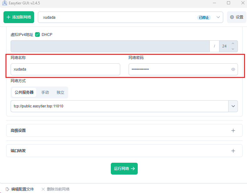 然后网络名称和网络密码填前面一样的就行,然后点击底部的运行网络,只要填的一样就能组合到一个网络里面,就能组网成功